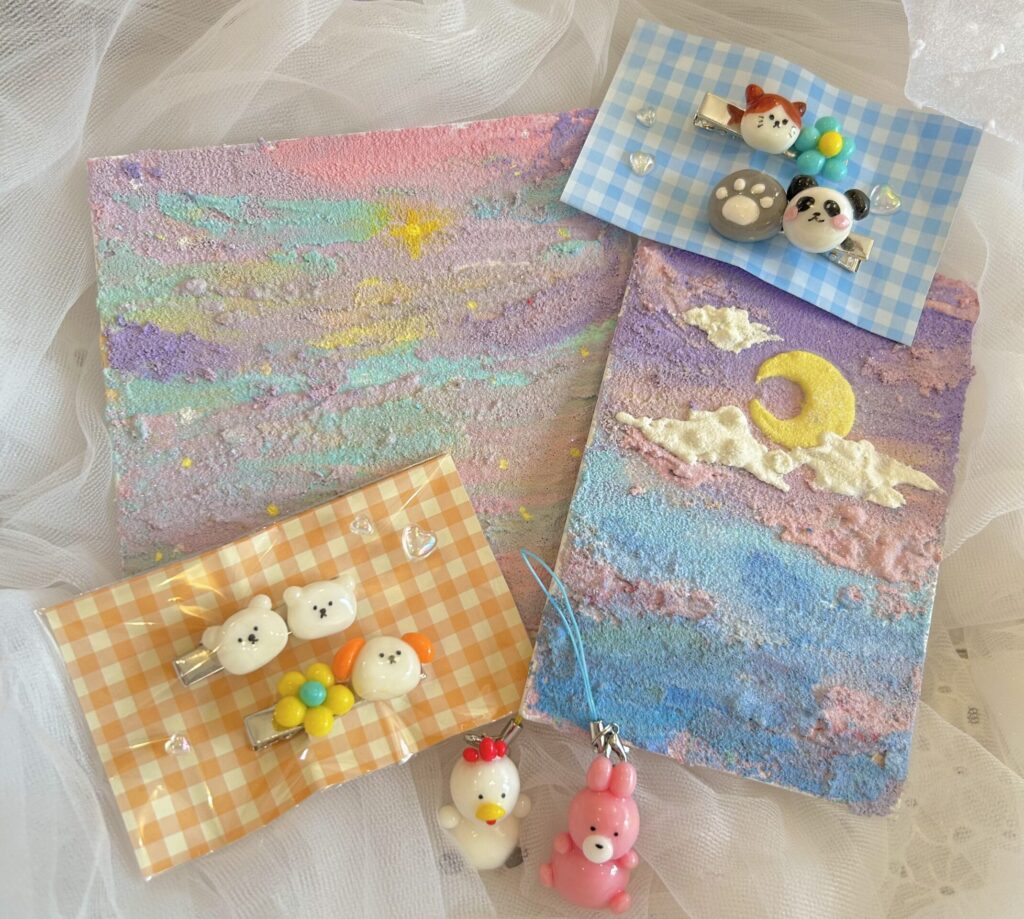 お花のラッピング、テクスチャーアート、樹脂粘土を使ったアクセサリー作りなどの、花とアート体験で自由に表現してみましょう。